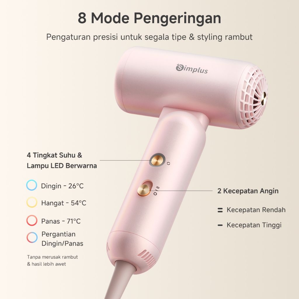 Simplus Pink MINI 293g Hair Dryer Lipat 8 Mode Pengeringan Angin 70m/detik