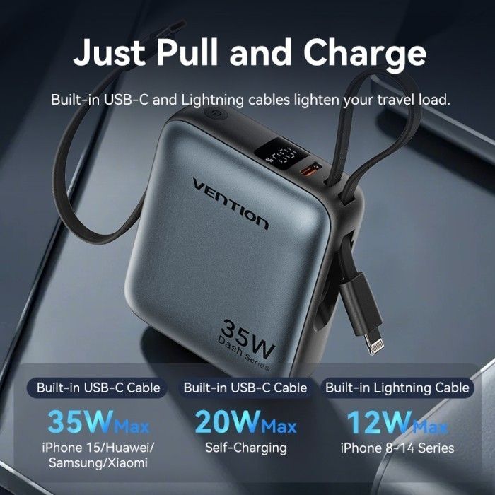 VENTION Mini Power Bank 10000mAh (USB-C + USB-C/Lightning) with Built-in USB-C and Lightning Cables