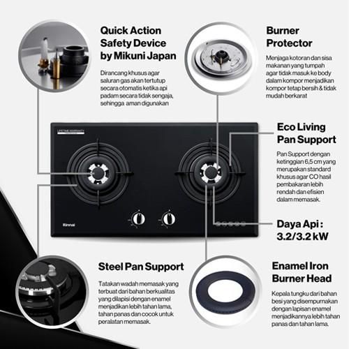 RINNAI RB-772 RO (G) / RB-772 ROG Kompor Gas Tanam Kaca 2 Tungku