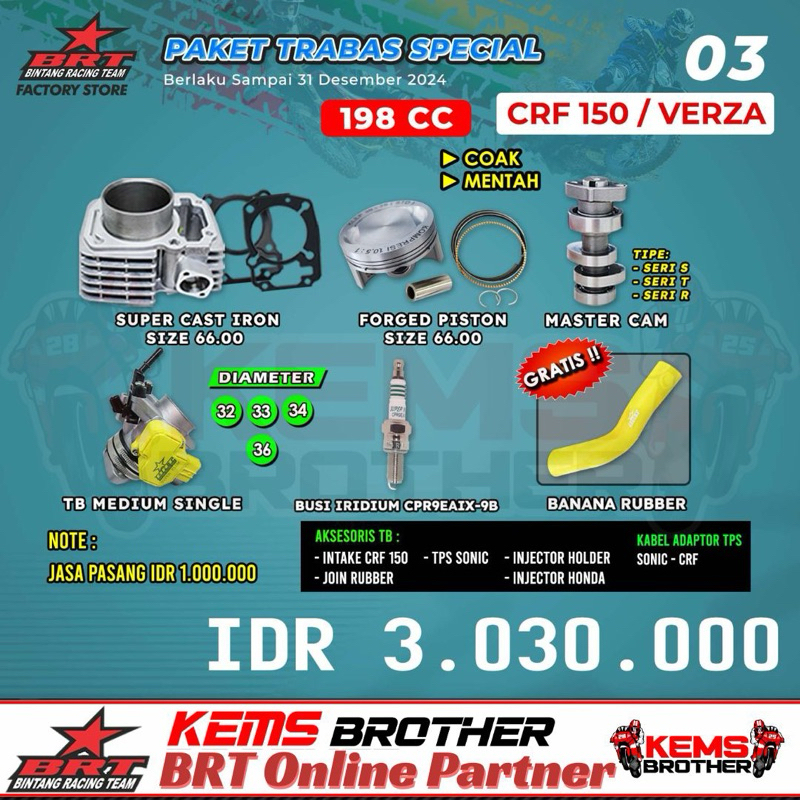 PAKET BRT CRF TRABAS SPESIAL 3 BOREUP 200CC/210CC (blok piston kit casting iron, noken as, TB, Busi)