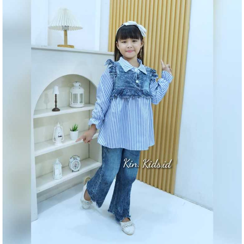 Baju Setelan Anak Perempuan Salur Celana Jeans Cutbray Baju Kemeja Salur Usia 3-9 Tahun- Kin_Kids.Id