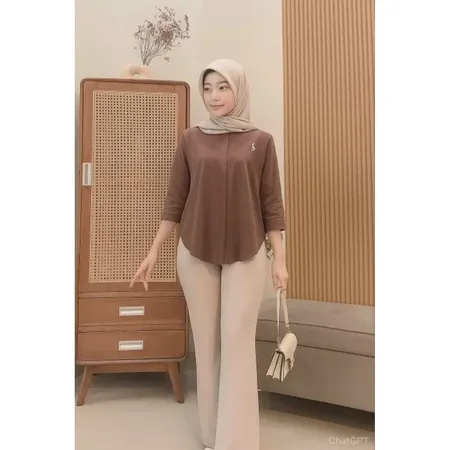 Kemeja Bordir Logo Polo Atasan Wanita Rayon Twill Lengan 7/8 Terbaru