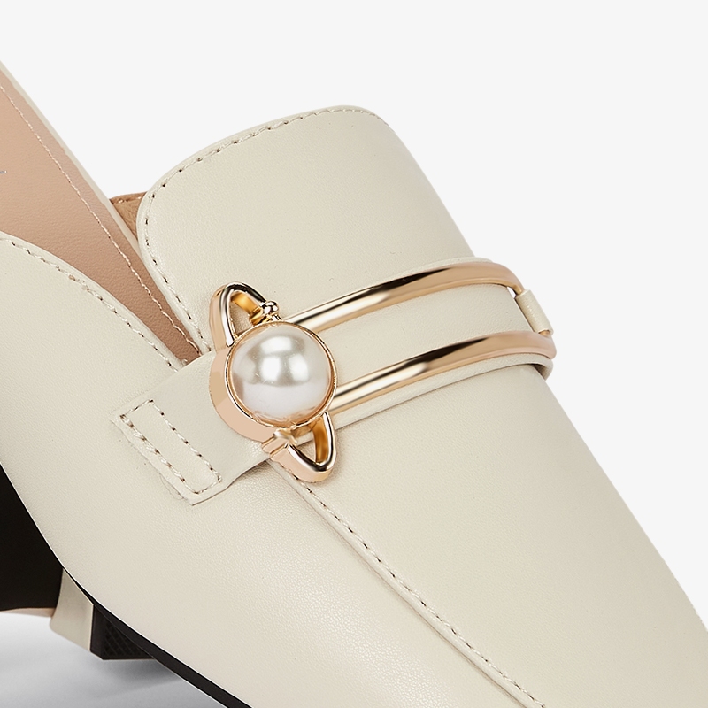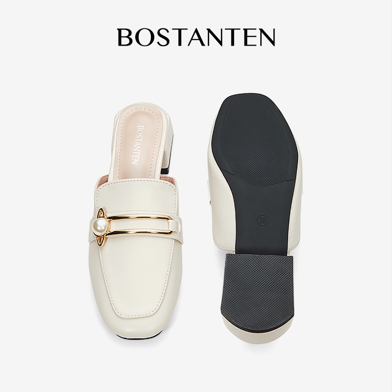 BOSTANTEN Sepatu Hak Tahu Sepatu Mules Flatshoes Heels Sepatu tunggal dengan tumit berat wanita, kepala persegi, sepatu mutiara kecil, sepatu rata