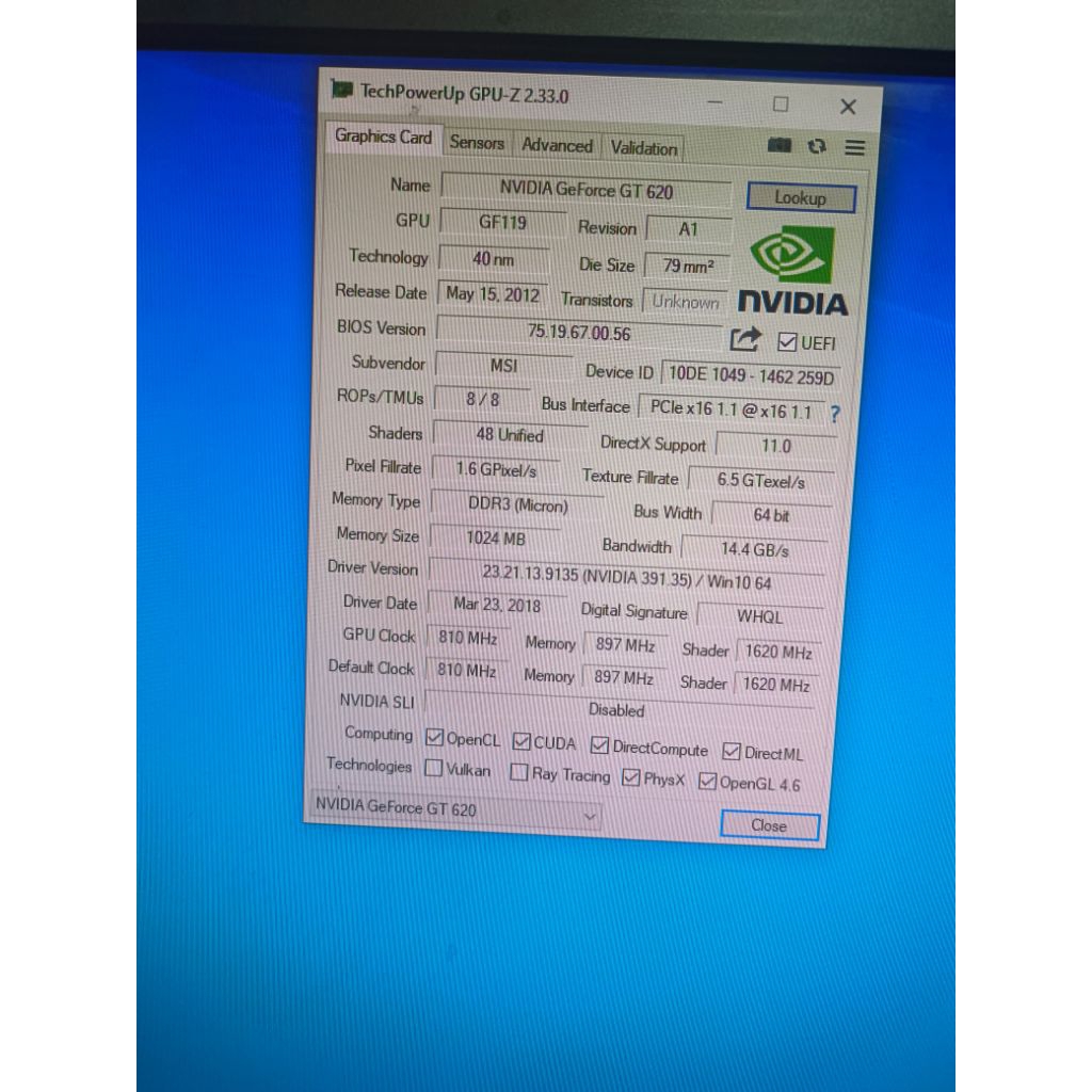 VGA Card NVIDIA GeForce GT 620 DDR3 1GB 64BIT for CPU