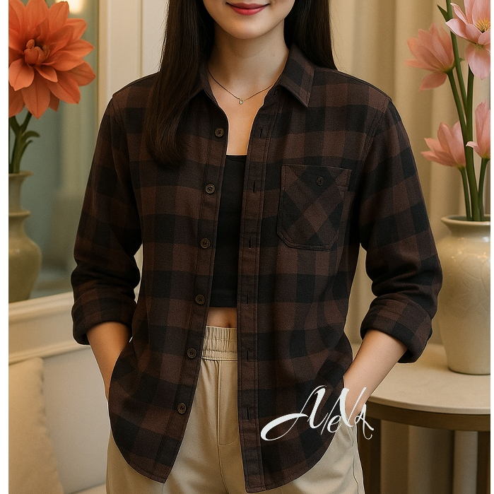 Kemeja flanel lengan panjang wanita casual distro surfing motif square unisex terlaris
