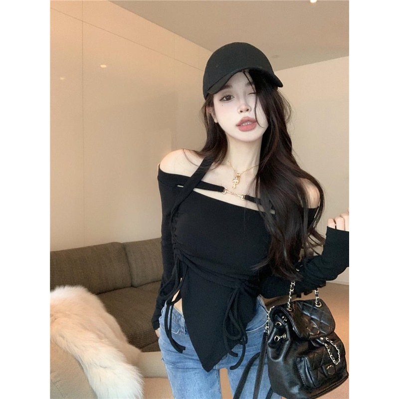 Cohan Ds011 Women's CropTop Slimbody Square Neck Long Sleeve Hitam Putih S/M/L