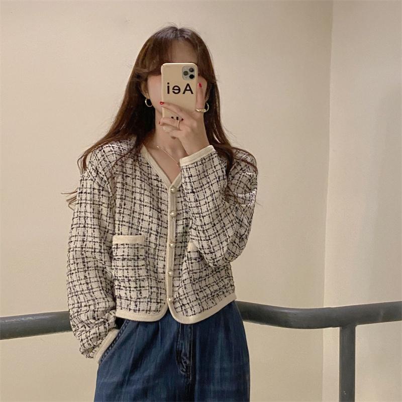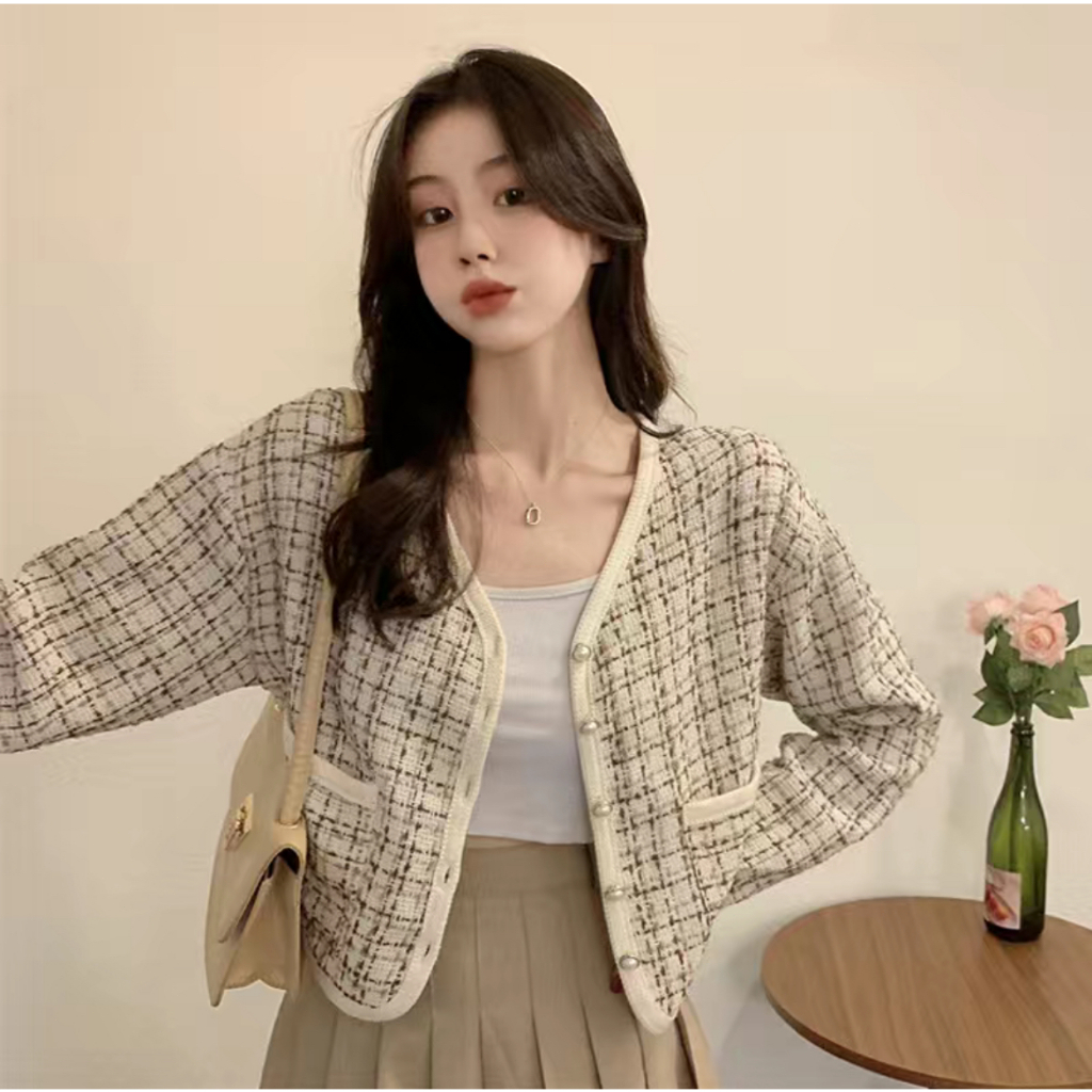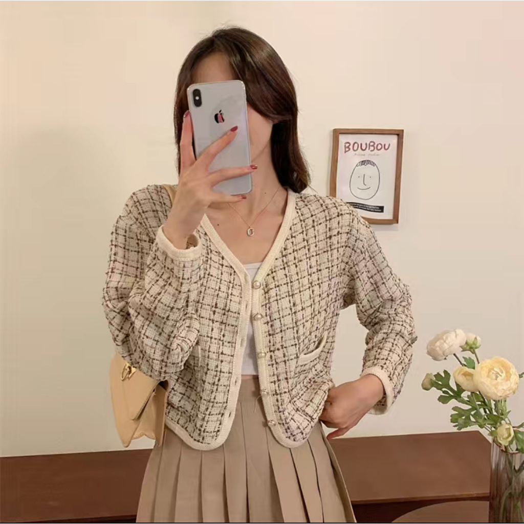 SEZO. jaket wanita korean style V-Neck jaket crop wanita outerwear pakaian Wanita retro import