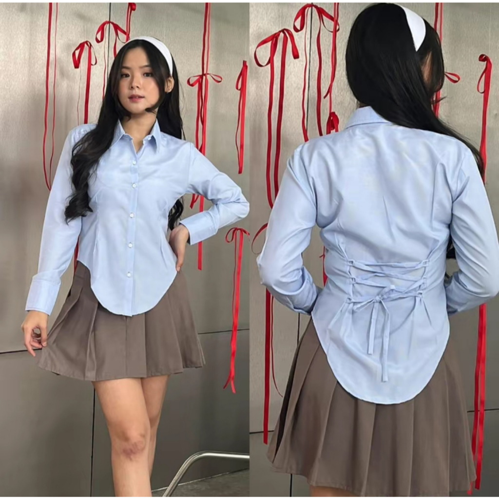 Selena Kemeja Blose wanita Slim Fit Long Sleeve tali belakang