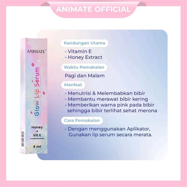 Animate Glow Lip Serum 4ml dengan Vitamin E dan Honey Extract untuk Bibir Sehat Merona - Kering