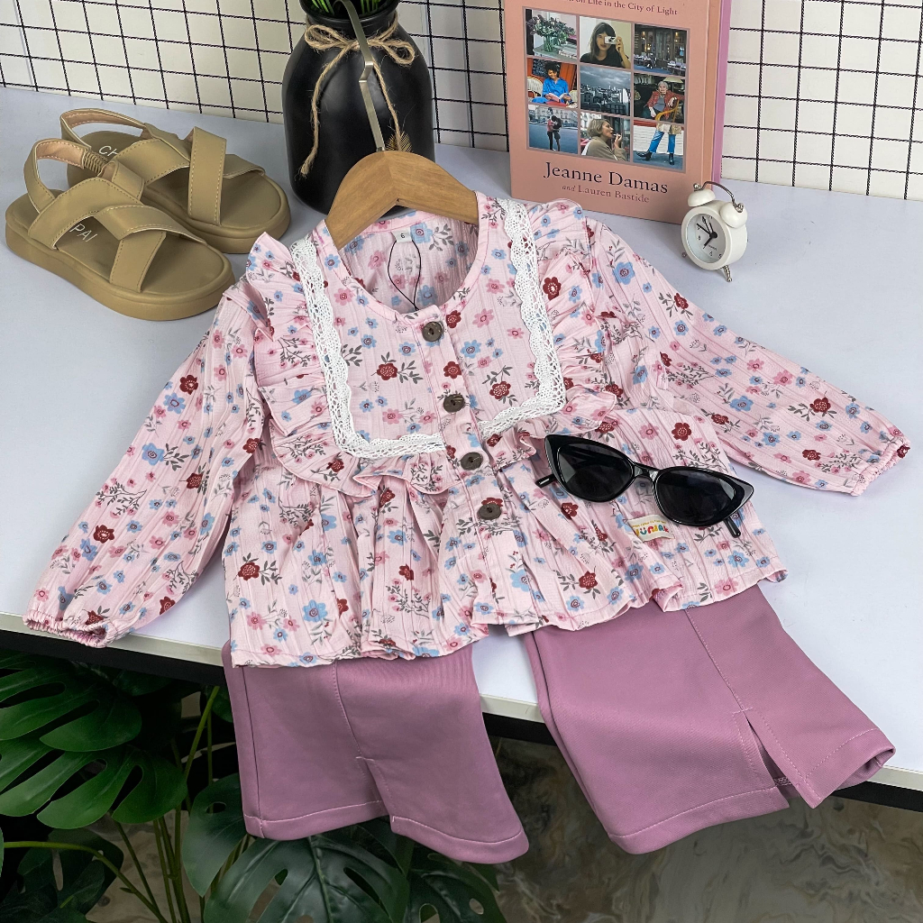 AURELIA Lilac Set Baju Celana Anak Cewek Lengan Panjang Motif Bunga Crinkle Premium -BAP-37