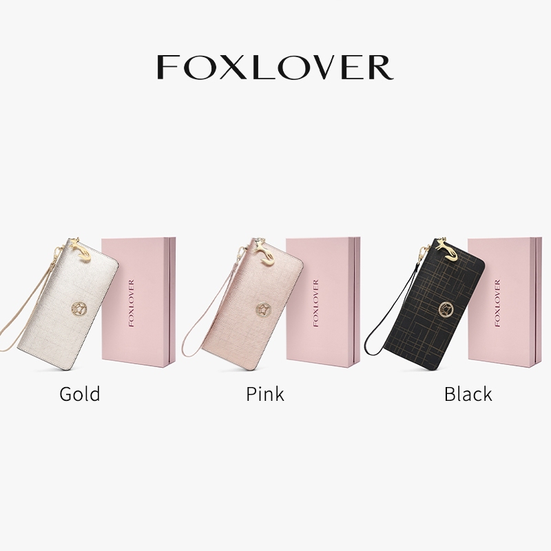 FOXLOVER Dompet Panjang Wanita Resleting Kulit Asli Premium RFID Warna Pink em4s Hitam