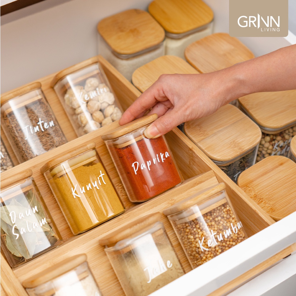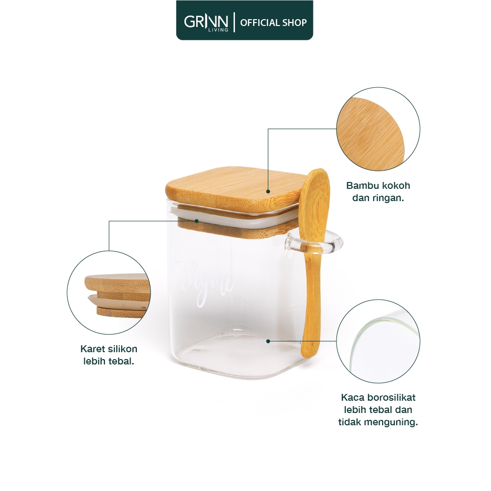 GRINN LIVING Terra Jar / Toples Kaca Kotak Tutup Kayu / Bambu untuk Tempat Penyimpanan Bumbu Dapur dengan Sendok Aesthet