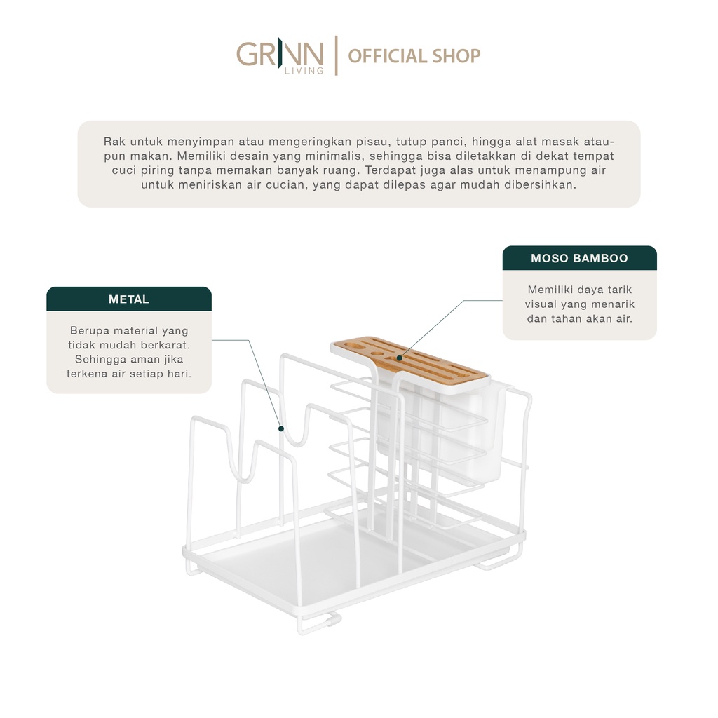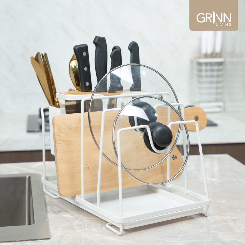GRINN LIVING Gamma Organizer / Rak Alat Masak / Piring / Tutup Panci / dengan Tempat Pisau / Talenan dari Besi Aesthetic