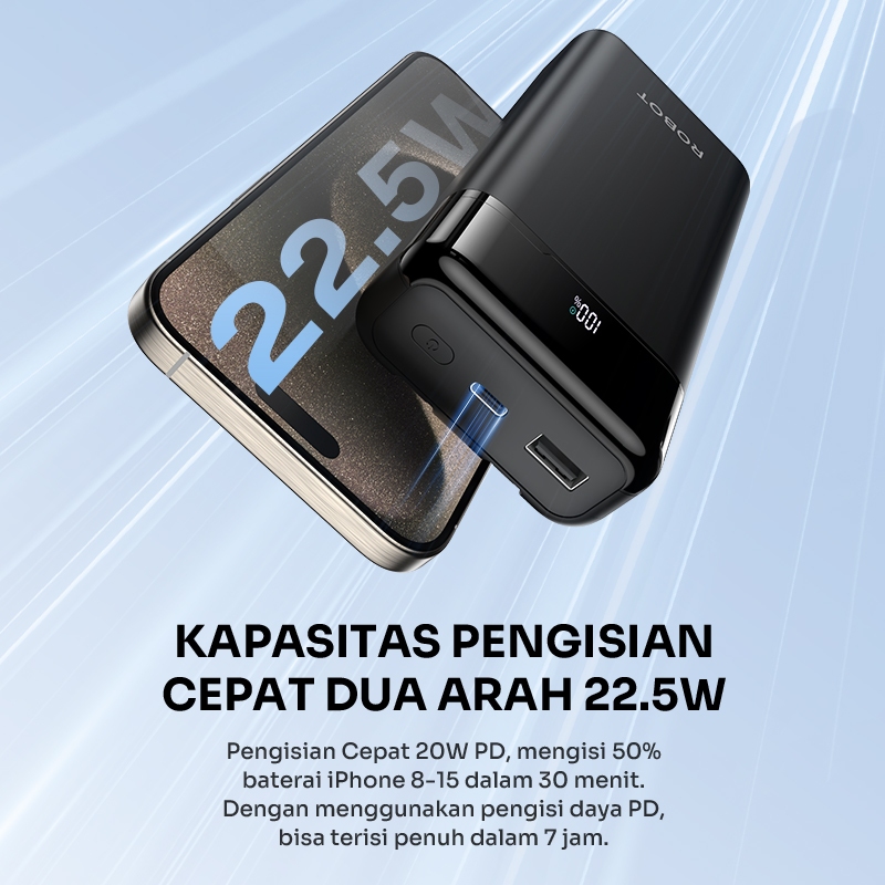 ROBOT Powerbank Fast Charging 20000mAh 22.5W 2 Built in Cable Type C Lightning LED Display Power bank RT25 Original - Ga