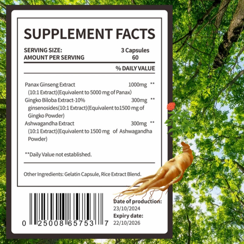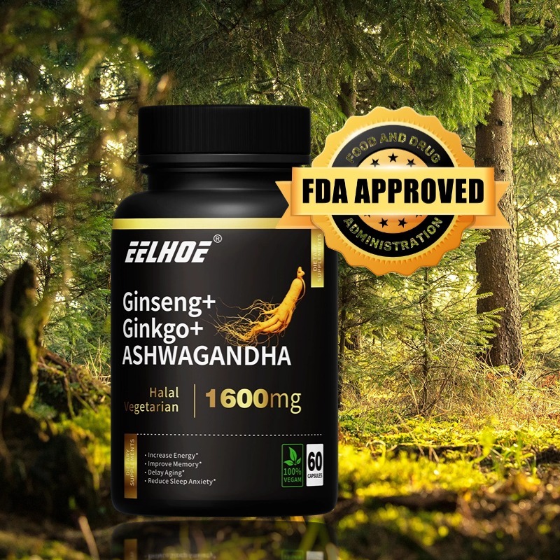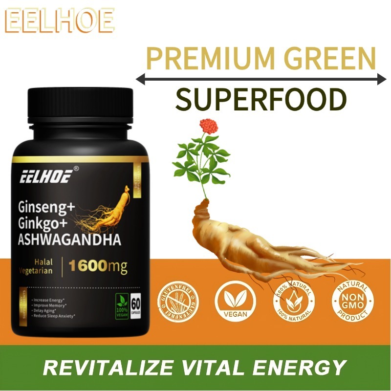 Ginseng, Ginkgo Biloba, Ashwagandha 1600 mg Meningkatkan sirkulasi darah, daya ingat dan konsentrasi