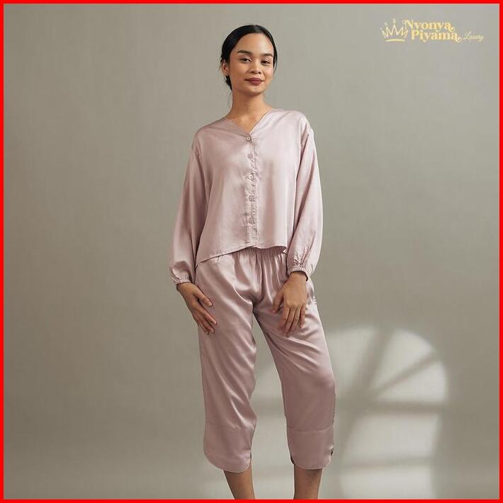 Nyonya Piyama Luxury Bamboo Silk Moon Set Mona Baju Celana Nyaman Santai Wanita Tidur Panjang Setelan Basic Atasan Satin