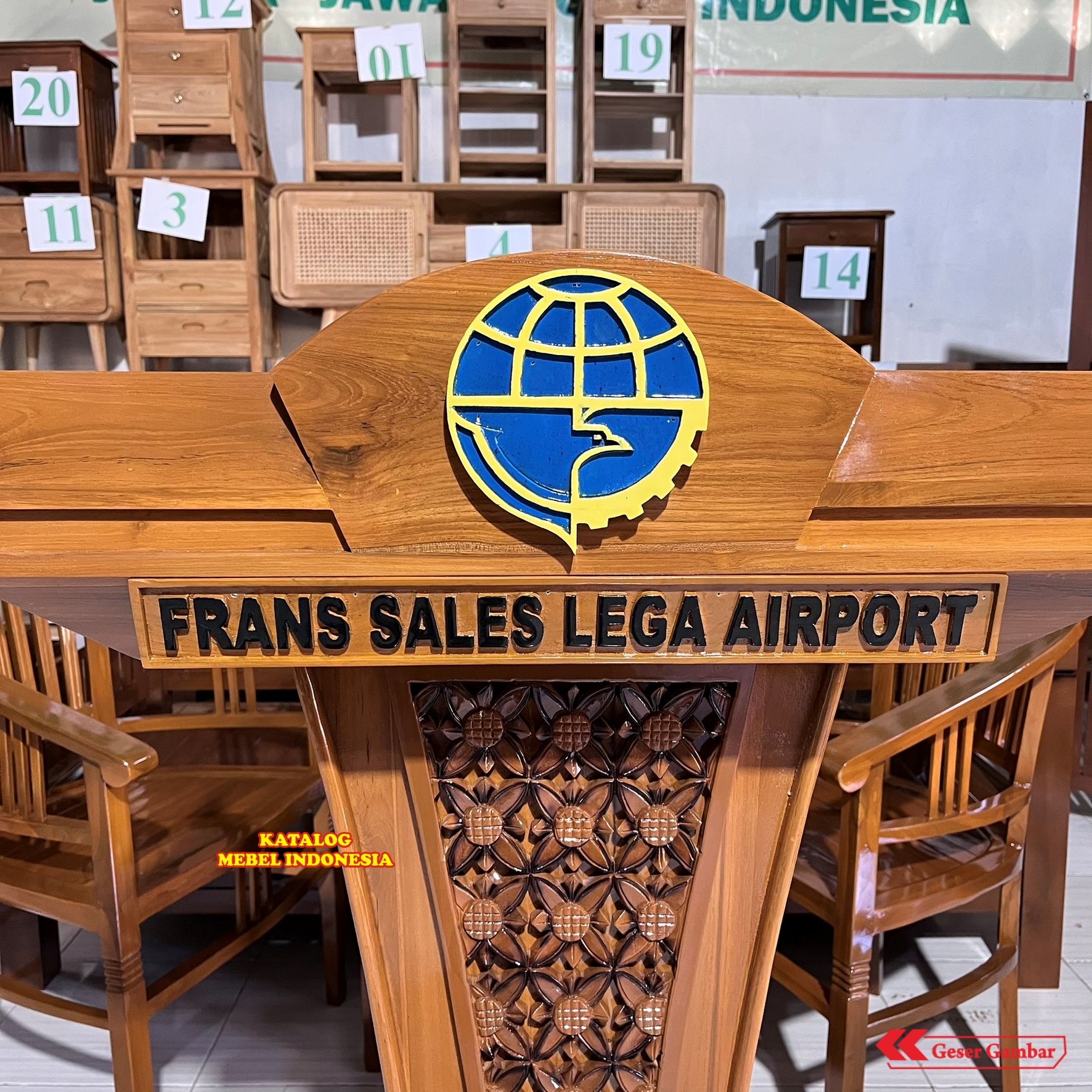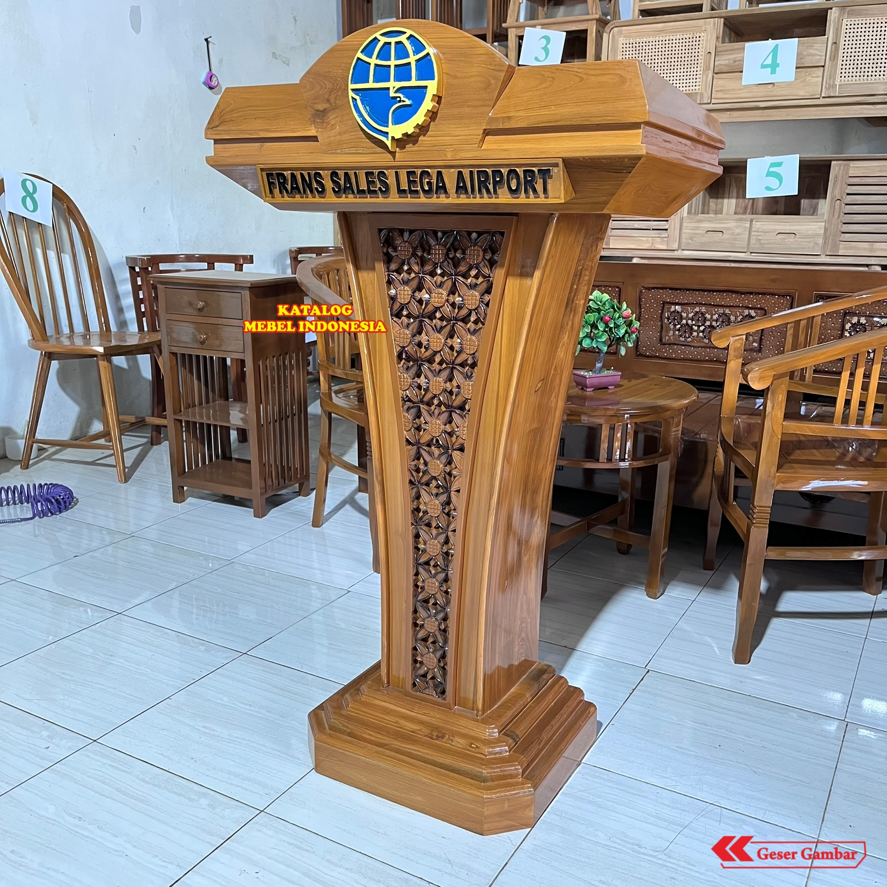 Podium Kayu Jati Premium Ukir Batik - Mimbar Presiden Kantor Hotel Sekolah - FREE Custom Logo