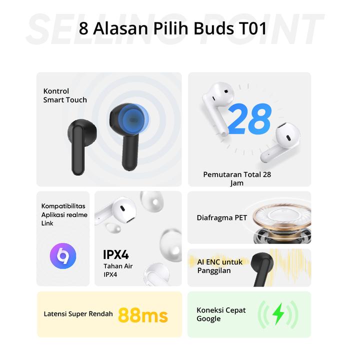 [Official Store ✔️] realme Buds T01 (13mm Dynamic Drive | AI Noise Cancelling | IPX4 Tahan Percikan Air | Bluetooth 5.4)