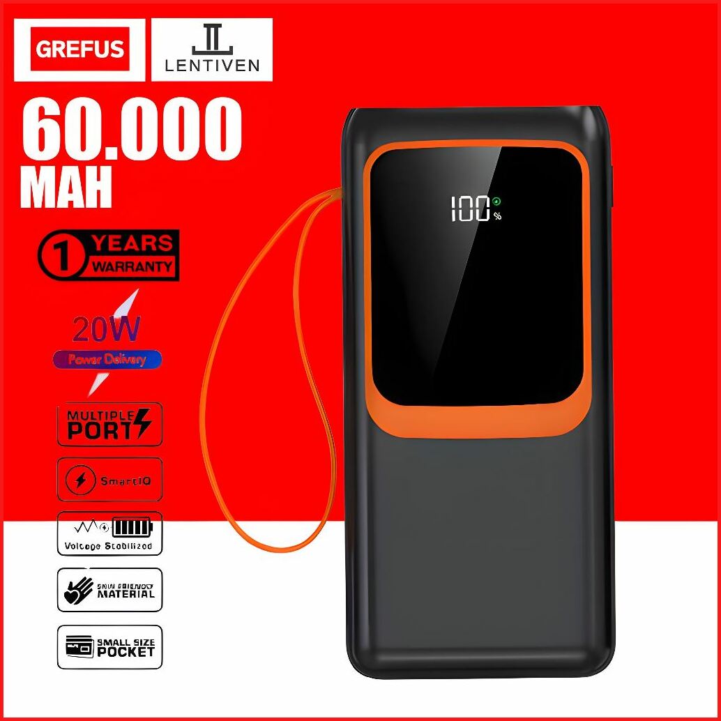 Grefus Lentiven Powerbank 60000 Mah Fast Charging With Dual Kabel Data Type C Lightning