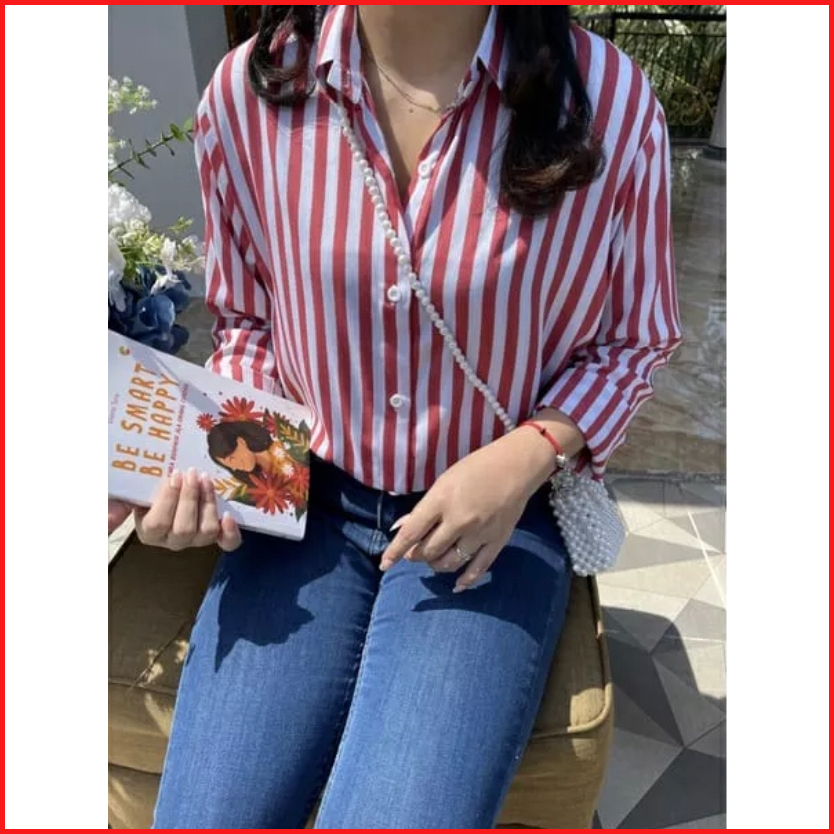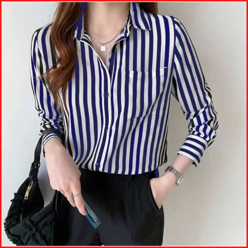 Blouse Stripe Shirt Top 0versize Kemeja Atasan Salur Lengan Panjang