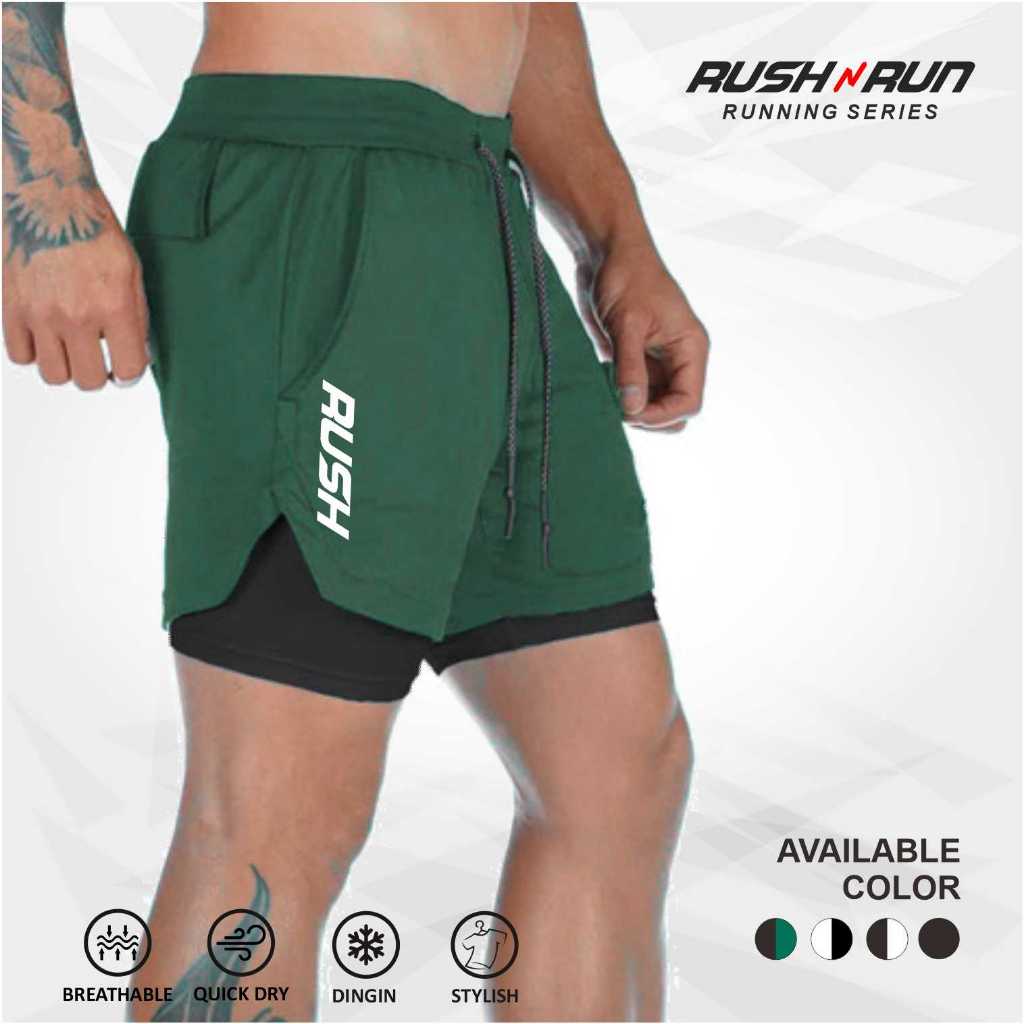 RUSH N RUN CELANA OLAHRAGA PRIA 2 IN 1 BAWAHAN LARI RUNNING GYM FITNESS INNER LEGGING BAHAN DRY FIT