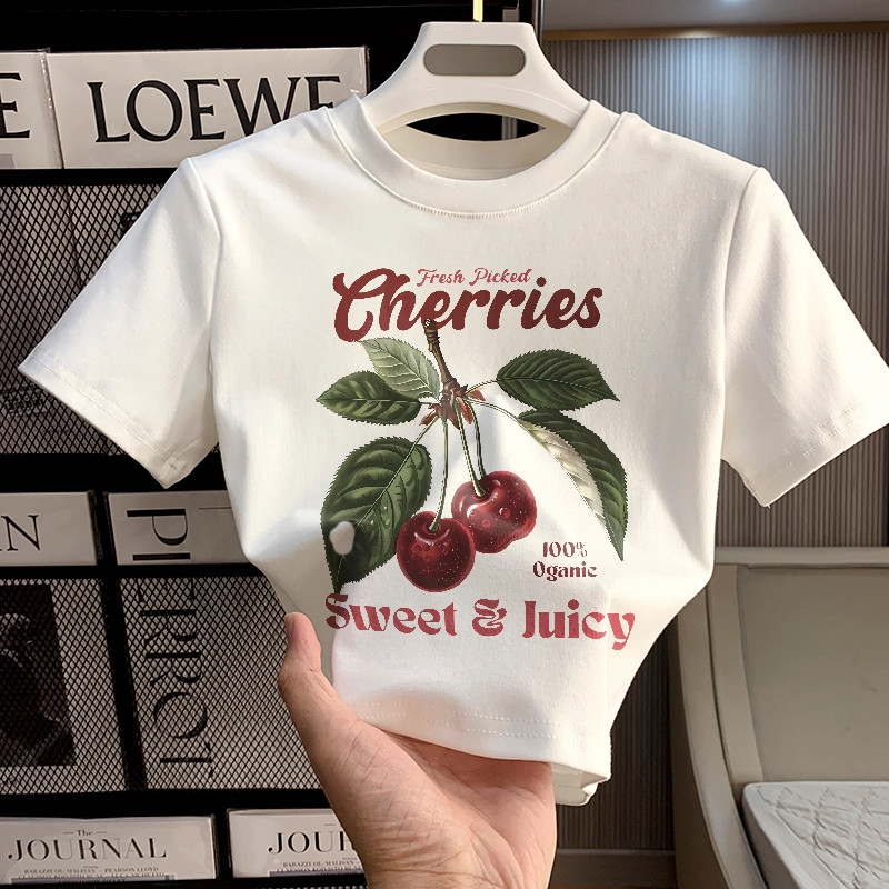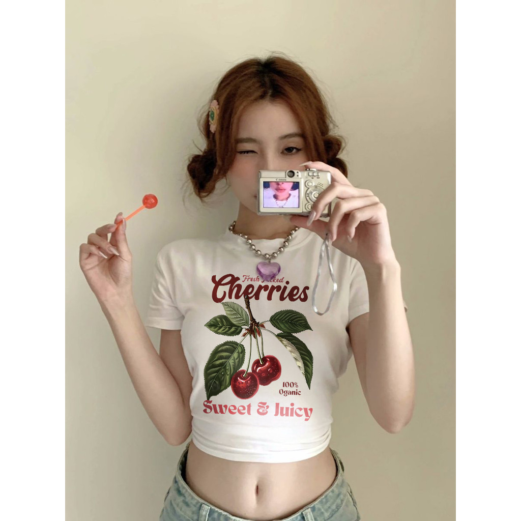 Misco Crop Top y2k Kaos Wanita Lengan Pendek Delicious Cherry Letter Print Baju Crop Top Korea Style 100% Cotton