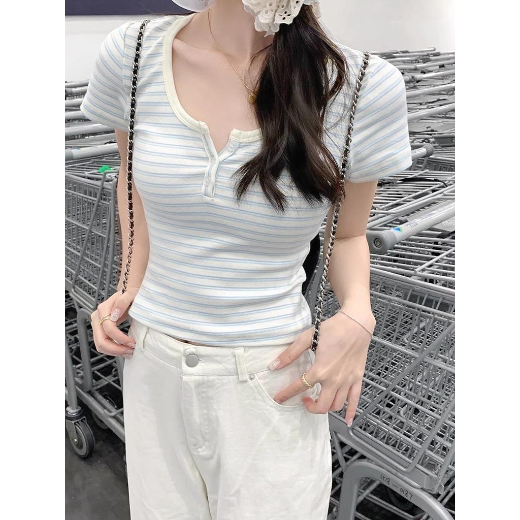Baju Kaos Crop Top Salur Merah Muda Cotton Combed Kerah Setengah Terbuka Wanita Premium