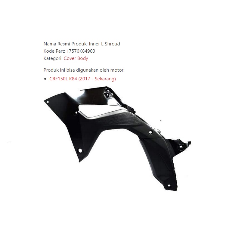 COVER INNER L/R, KAPER BODY COVER BODY DALAM CRF 150L, BODY HITAM KASAR 17560K84900 (R) 17570K84900 (L)