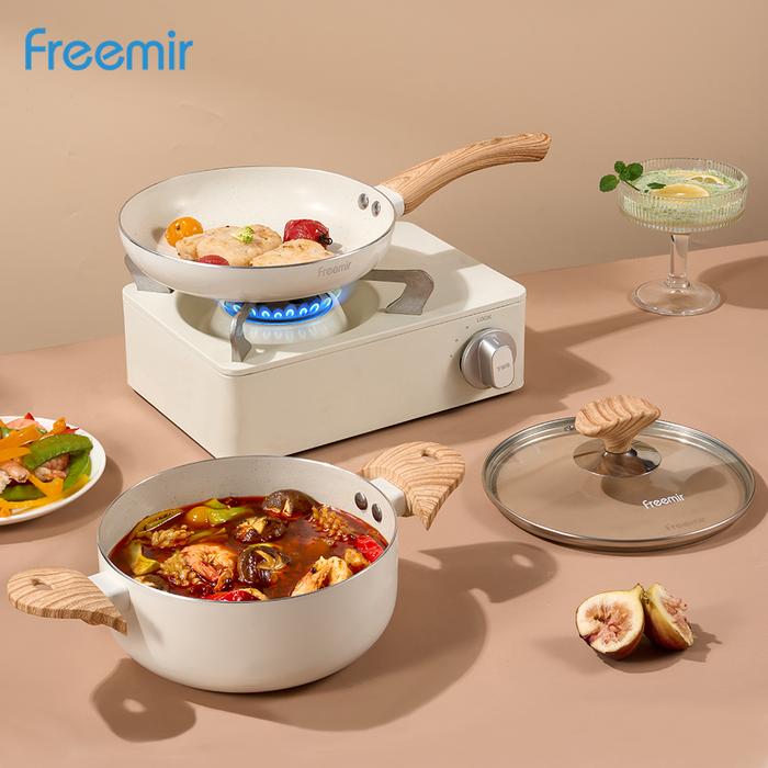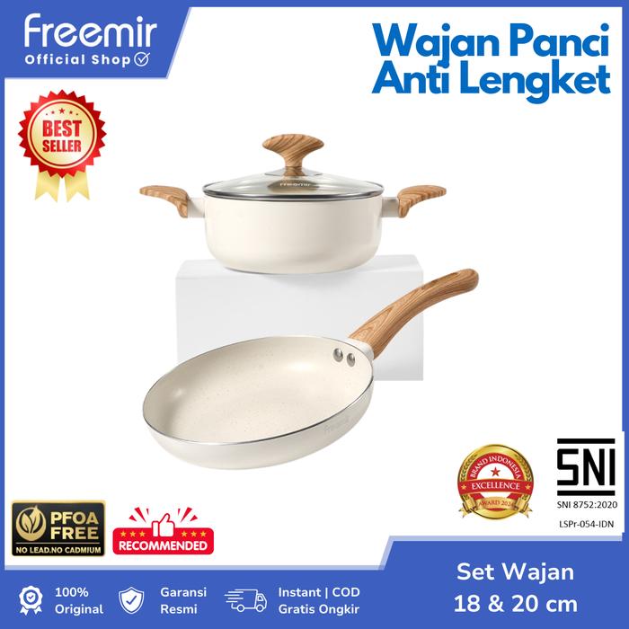 [Sale] freemir Bundle Wajan + Panci Anti Lengket 18/20 Cm Tutup Kaca Gagang Kayu Anti Panas Kitchenware
