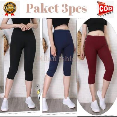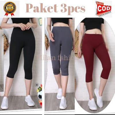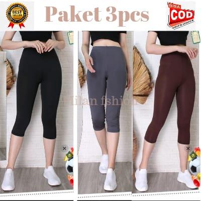 PAKET 3PCS LEGGING 3/4 BAHAN SPANDEK PREMIUM JERSEY POLOS CELANA WANITA PANJANG - HITAM ABU KULIT, STANDAR 35 - 56KG