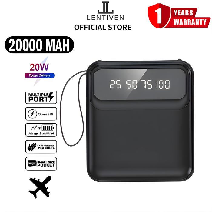 LENTIVEN Powerbank 20000 MAH Mini Fast Charging Dengan 4 Kabel Data LED Display