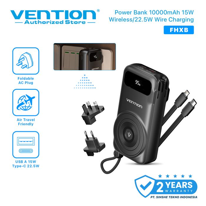 Vention Travel Charger Powerbank Wireless with Built in Type C Lightning Cables & AC Plug 22.5W 10000mAh