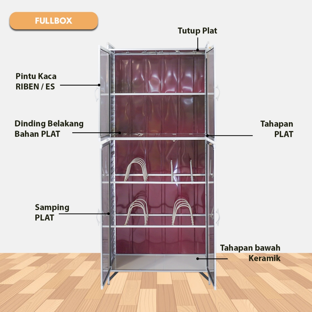 Lemari Rak Piring & Makanan Aluminium 2 Susun 4 Pintu – Kaca Riben / Kaca Es – 162cm