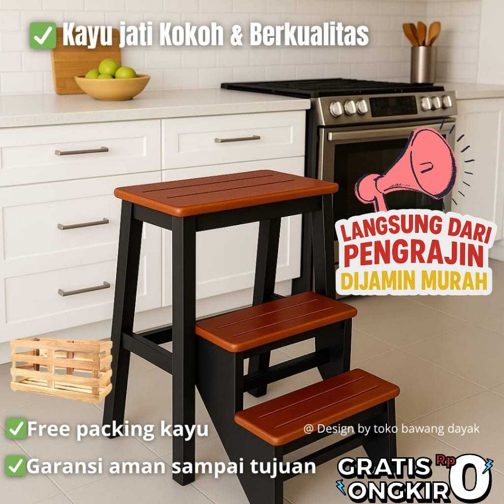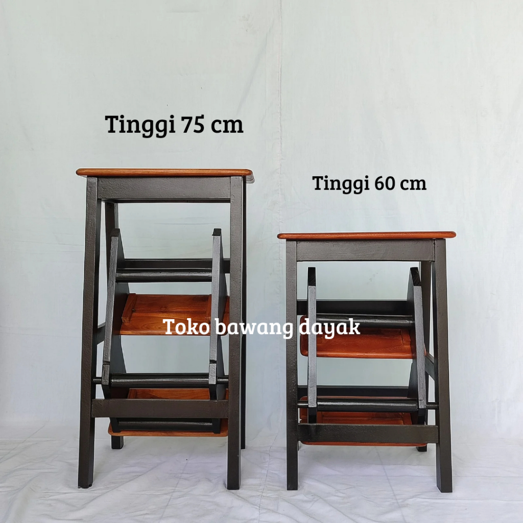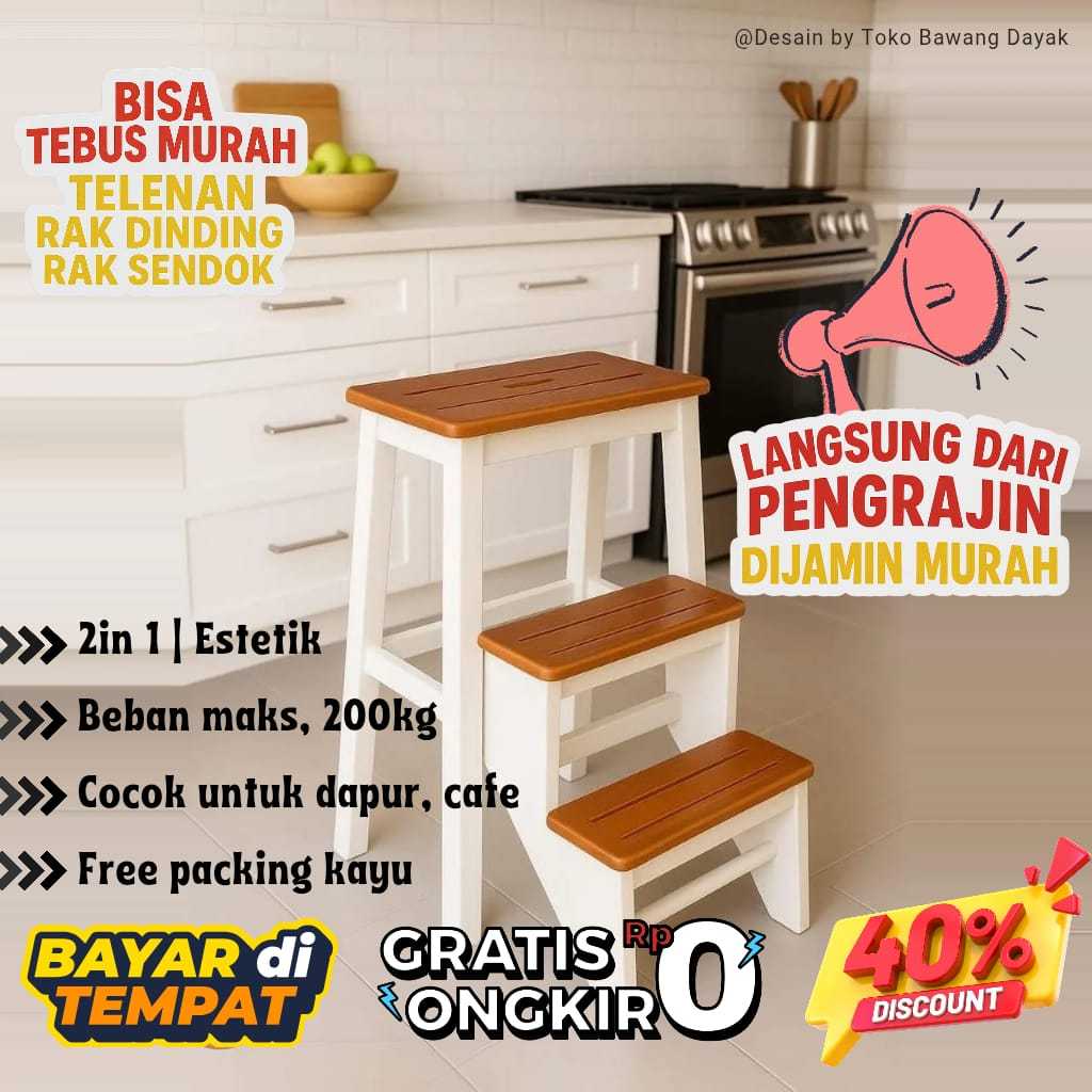 Kursi Tangga Lipat Kayu Jati Warna Putih – 3 Anak Tangga, Multifungsi 2In1, Minimalis Estetik