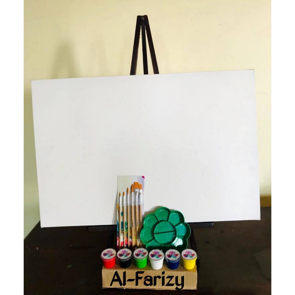 paket Kanvas lukis putih ukuran 60x80 cm set cat akrilik 6 warna kuas lukis palet