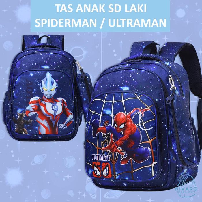 Tas Spiderman Anak Laki Laki SD Besar 43cm Gratis Pouch Motif Ultraman 0883 Kivaro Sekolah