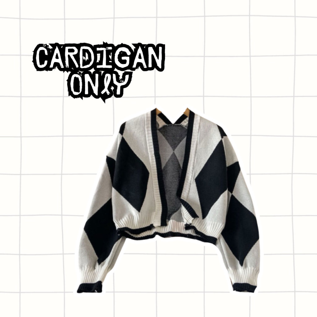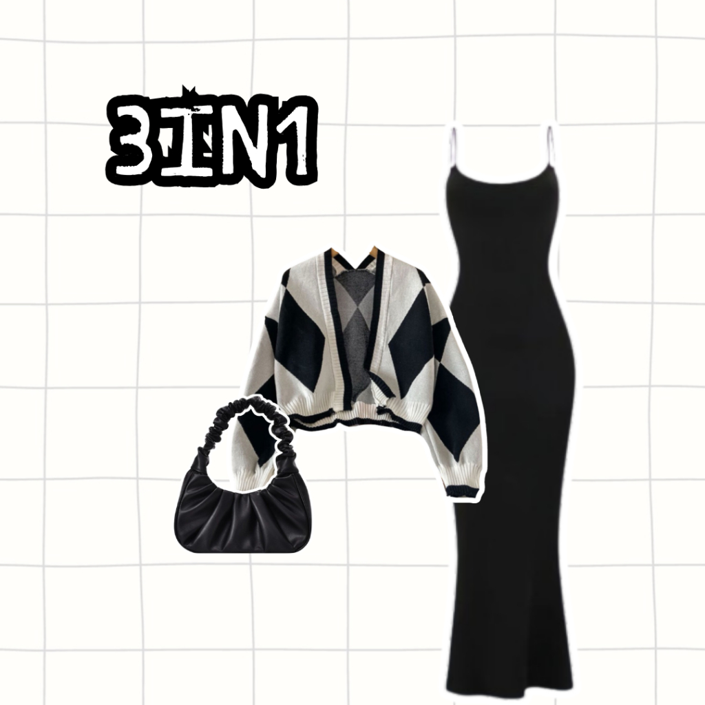 Dress Wanita Korea - One Set 3in1 Wanita | Cardigan Diamond Abu Dress Bodycon Hitam Tas Serut | Outfit Healing OJ84