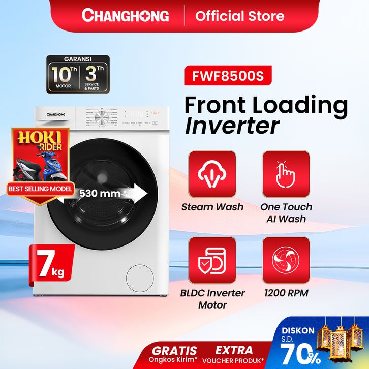 Changhong Mesin Cuci Smart Inverter Front Loading Kapasitas 7 kg Model FWF8500S