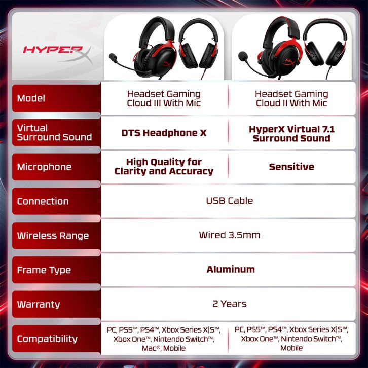 [Star] HyperX Cloud III Headset Gaming – Merah (Red) | Surround Sound, Mic Noise Cancelling Wired Gaming