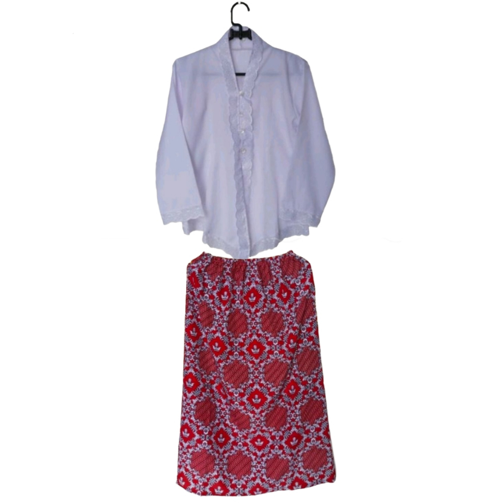 Setelan Kebaya Anak Putih Merah Lereng Seragam Sekolah TK SD Pakaian Baju Adat Perempuan Sunda Encim Motif Lereng