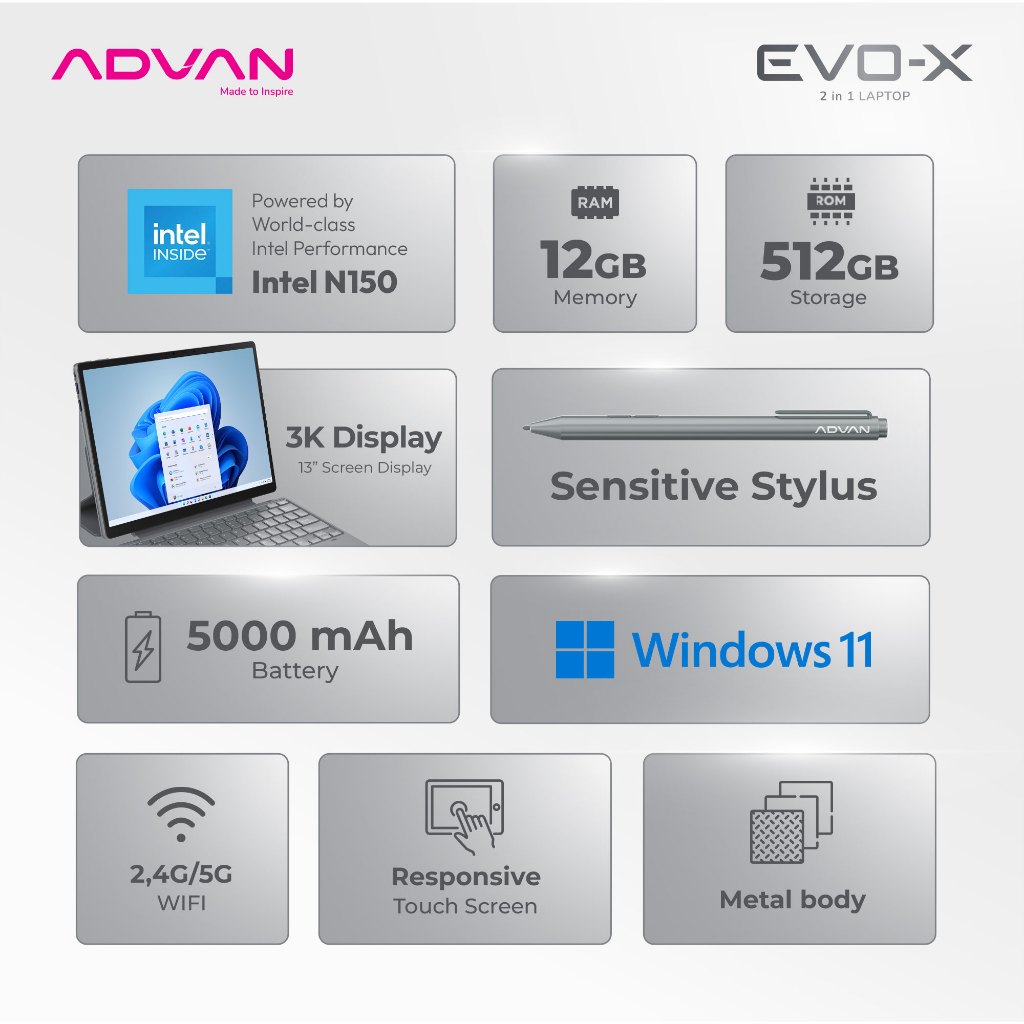 [FREE STYLUS PEN +KEYBOARD] ADVAN Laptop 2 in 1 EVO-X 16” / 13" Touchscreen Detachable 2.5K Display Intel i3-1215U/Intel