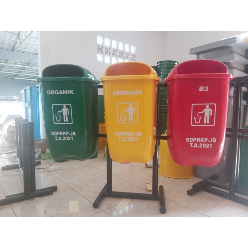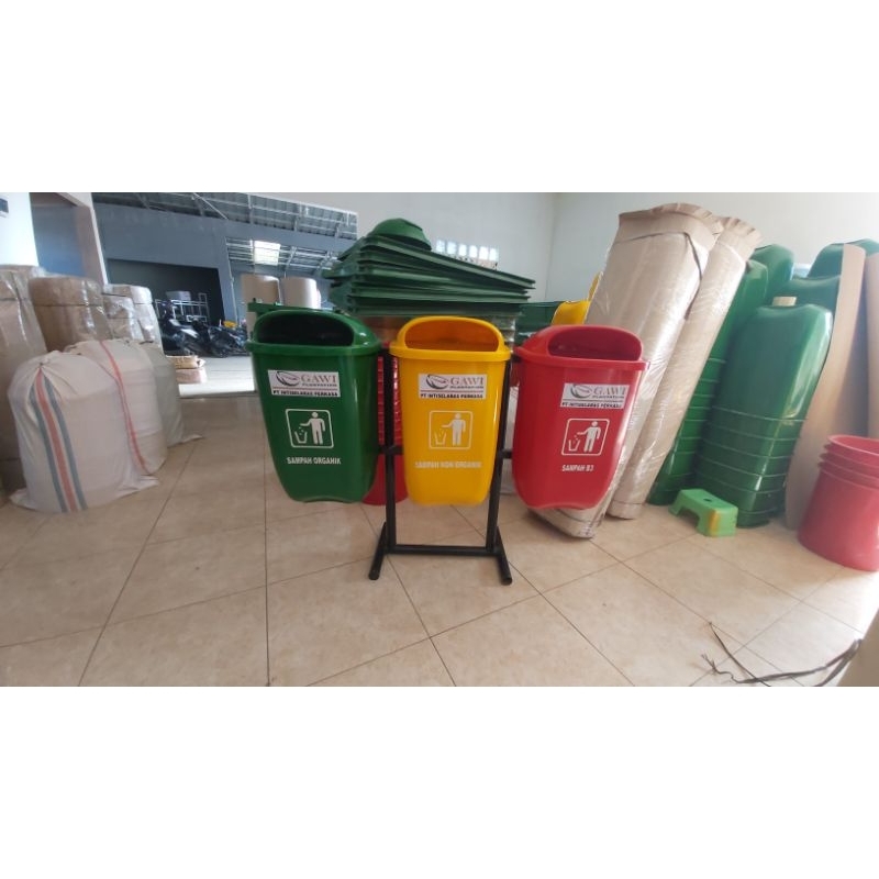 tempat sampah gantung model oval 3 pilah, tempat sampah outdoor, tong sampah gantung