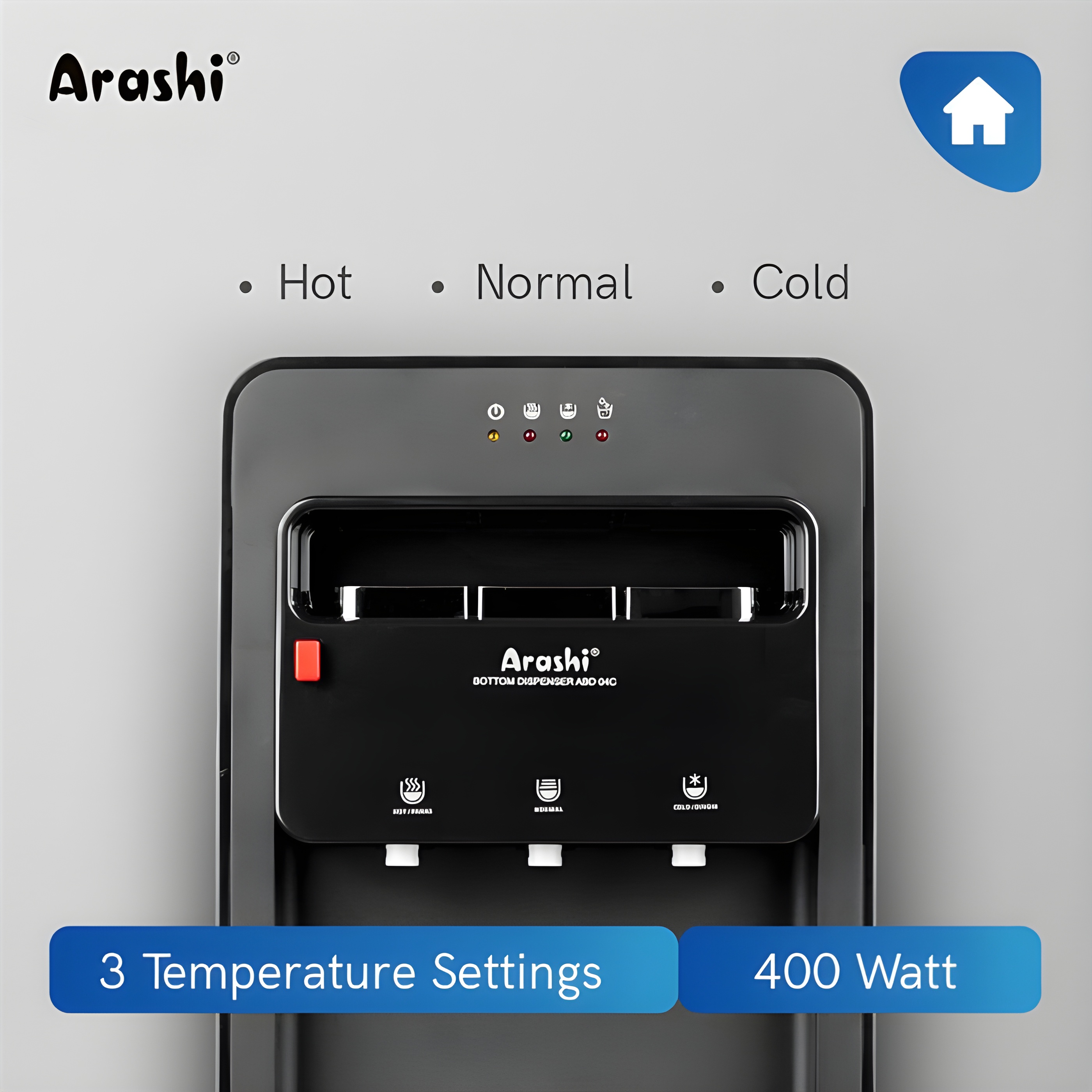DISPENSER ARASHI GALON BAWAH 3 KRAN ABD-04C AIR PANAS DINGIN DAN NORMAL ORIGINAL GARANSI RESMI