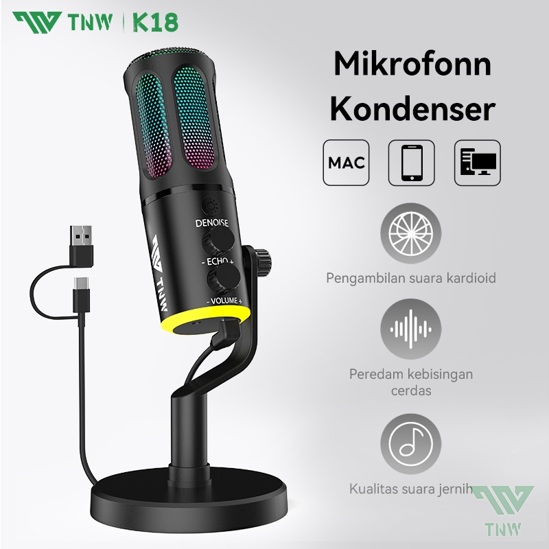 TNW K18 Microphone Condenser USB Type-C Mikrofon with RGB Dynamic Mic for PC LapT0P Streaming Gaming Recording