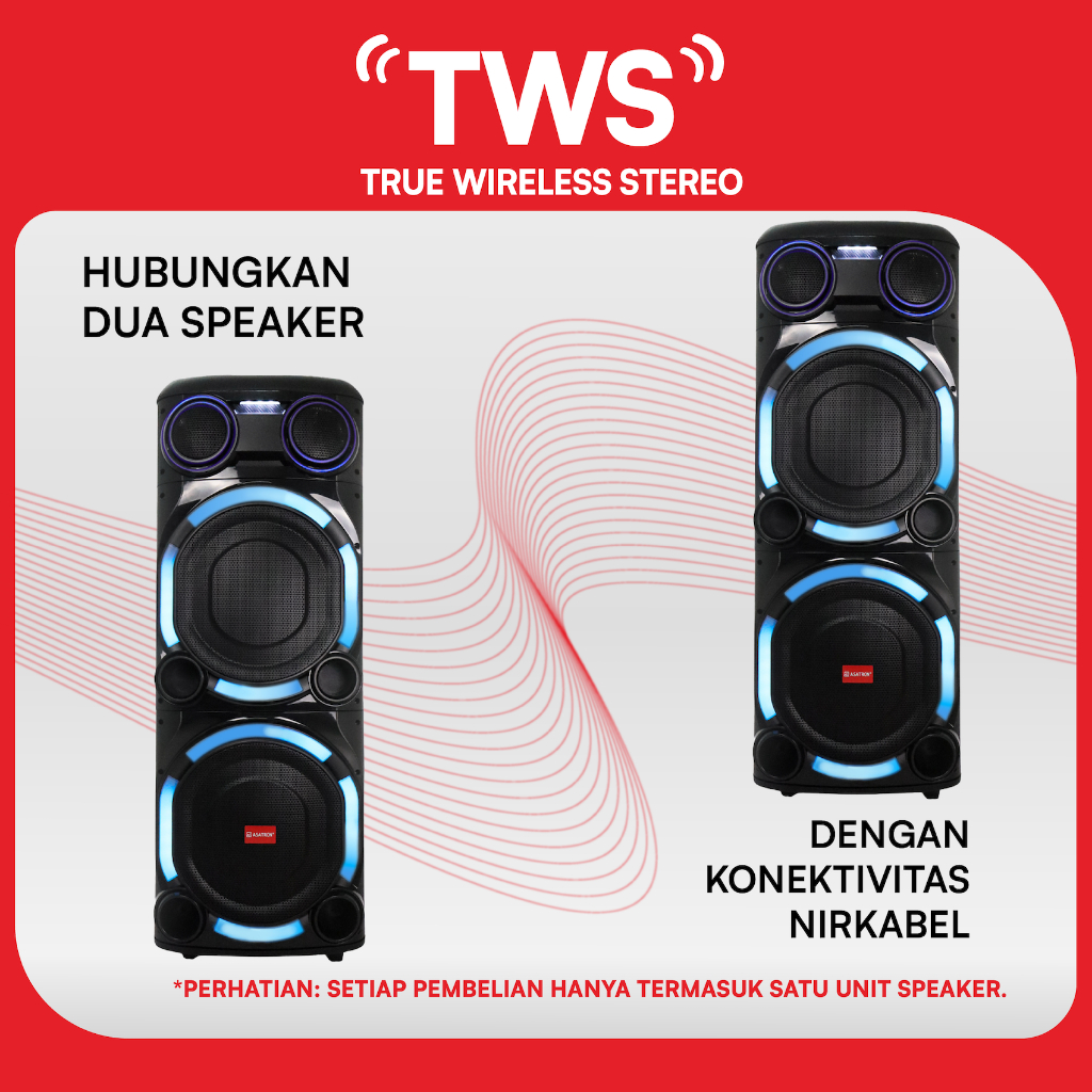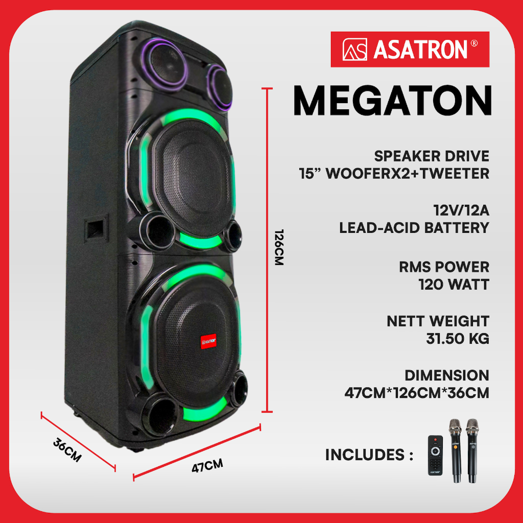 Asatron Megaton Dual 15 Inch Bluetooth Party Speaker with 2 Wireless Mic