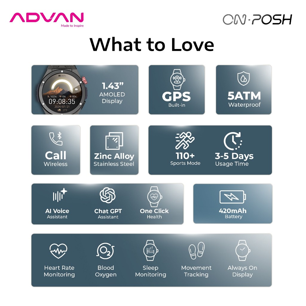 [BEST DEAL] ADVAN Smartwatch On Posh GPS Smart Ai Assistant Amoled 1.43" Bluetooth Call Waterproof 5ATM Jam Tangan Pinta