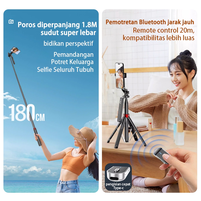 Akona 180CM Tongsis Tripod Handphone Bluetooth Remote Konten Kreator 360° Rotasi Tripod HP Anti Goyang 2 Lampu Dengan 1/