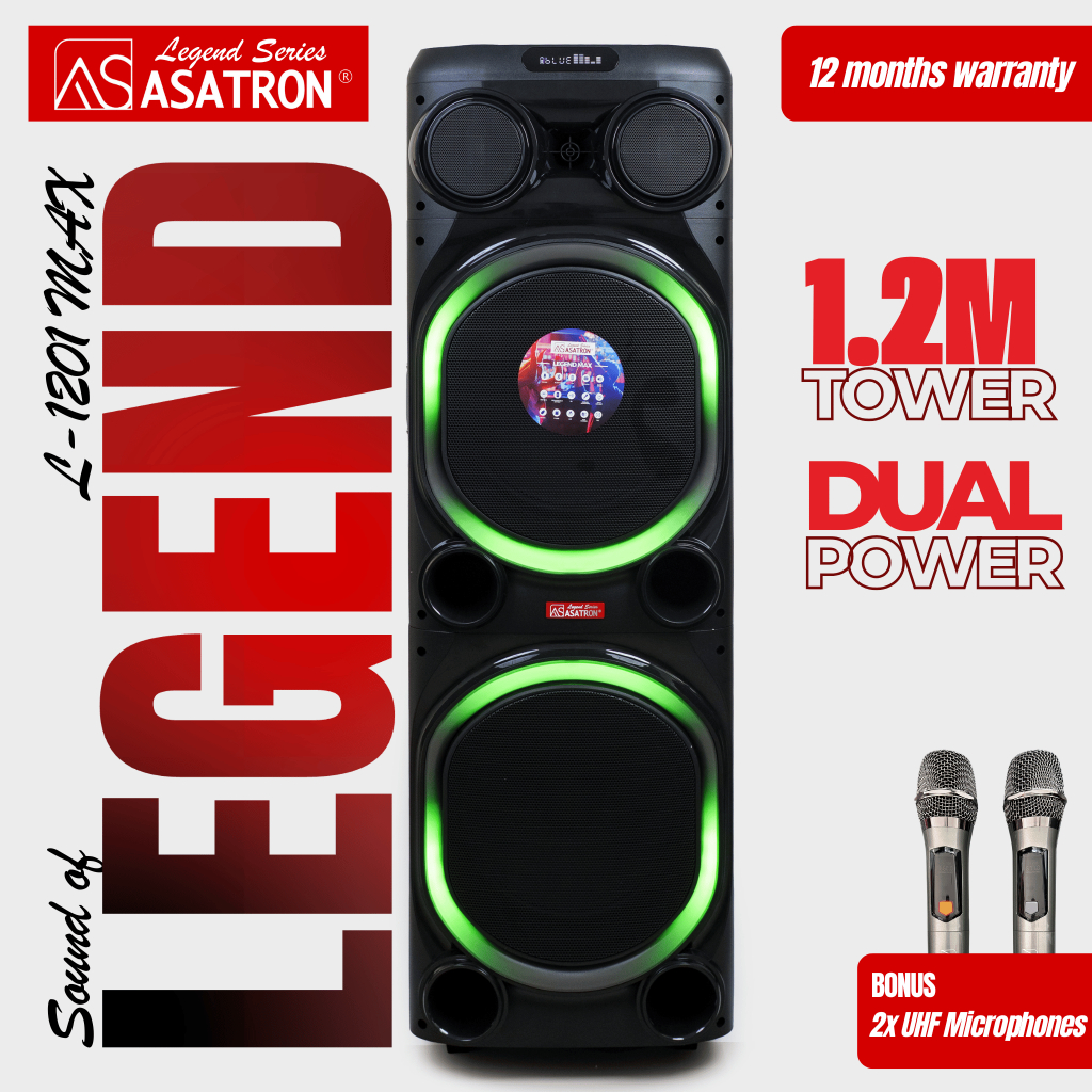 Asatron Legend L-1201 MAX Bluetooth Tower Party Speaker, Deep Bass, 2 UHF Wireless Mics