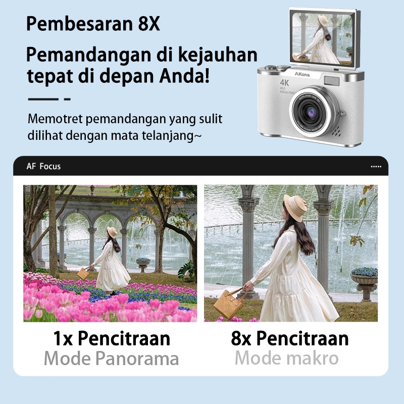 【Free 64G】Akona Kamera Digital 48MP 8X Zoom Digicam Layar Balik 180° LCD 2,4 Inci 4K Vlog Anti Goyang Filter Kamera Pock