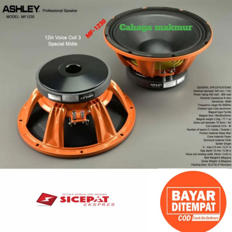 ASHLEY MF-1230.Professional Speaker Component 12 Inch, Voice Co'il 3 inch, Special Midle